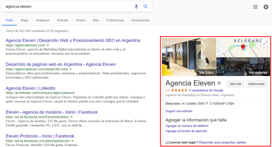 My Bussiness es un servicio gratuito de Google en el cual los propietarios de empresas pueden crear una ficha y actualizarla con datos tales como horarios, teléfono, dirección, sitio web, fotos y mucho más. Esta ficha aparecerá al buscar el nombre de la empresa, y además es lo que permitirá que se muestren resultados locales cuando Google interprete que vale la pena. En el ejemplo de aquí debajo vemos la ficha al buscar “Agencia Eleven”.