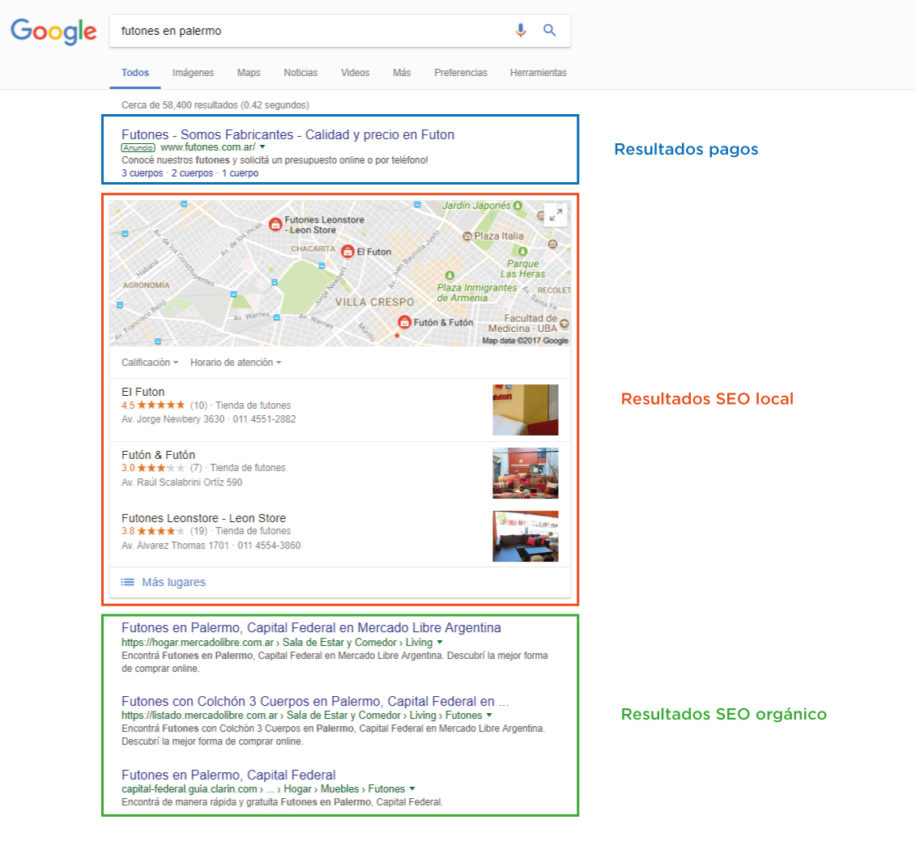 La sección de resultados locales se muestra de esa manera al buscar ‘producto/servicio + región’, como en el caso del ejemplo, pero también se muestra si buscamos ‘producto/servicio’ y el buscador detecta a través de nuestra ubicación que estamos en determinada región, y entonces nos muestra resultados locales para ese lugar. Si yo hubiera estado en Palermo y buscaba ‘futones’, probablemente hubiera obtenido resultados similares a buscar ‘futones Palermo’ desde nuestra oficina en Belgrano.